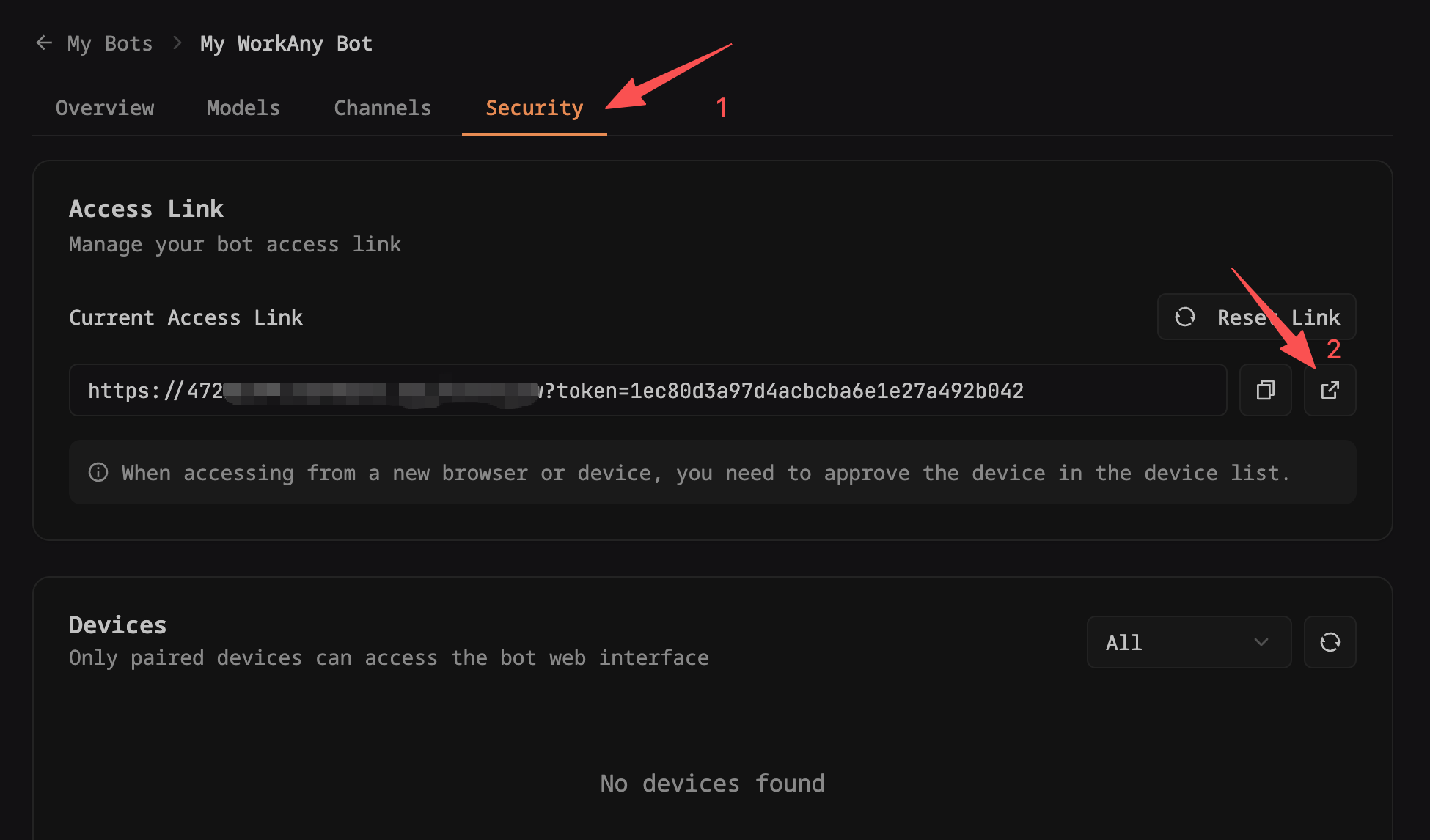 在机器人管理页面,点击 "安全" 标签页,点击 "访问链接" 的打开图标,在新标签页打开机器人网页版。