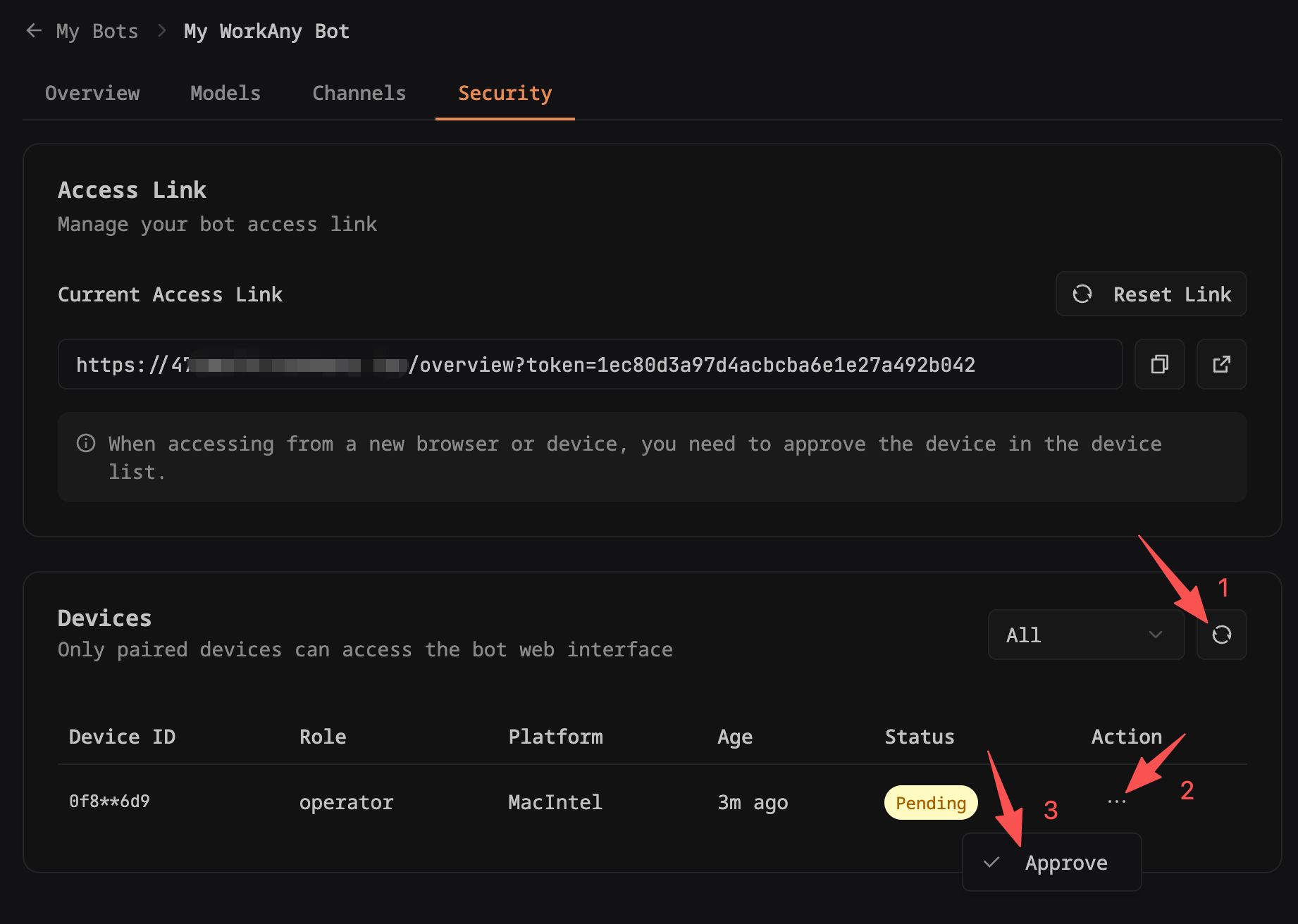 回到机器人管理页面的 “安全” 标签页,点击 "设备列表" 右上方的刷新图标,刷新待授权的设备列表。