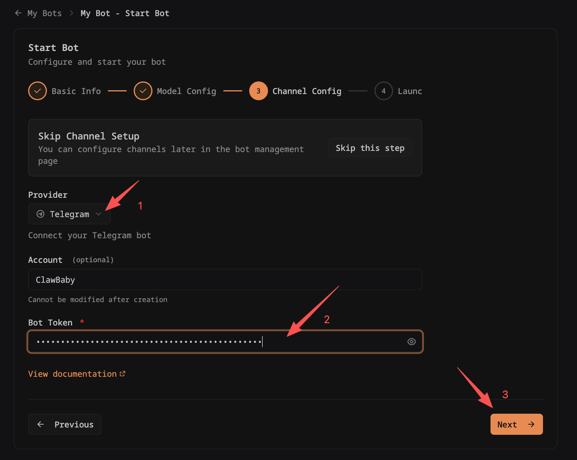 在机器人启动页面,第三个步骤,选择一个渠道,填入账号名称和 Token,点击 "下一步"。
