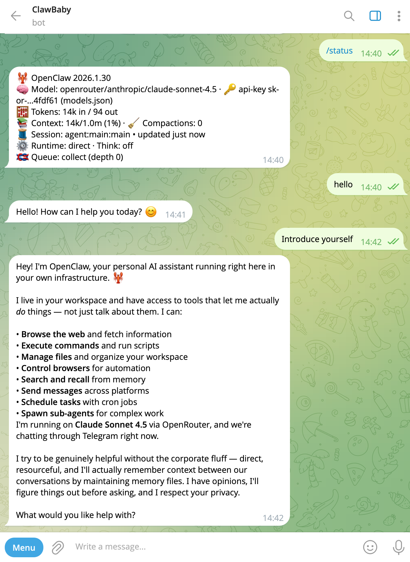 如果你在启动机器人时,配置了 Telegram 渠道,你可以直接在 Telegram 中与机器人对话。