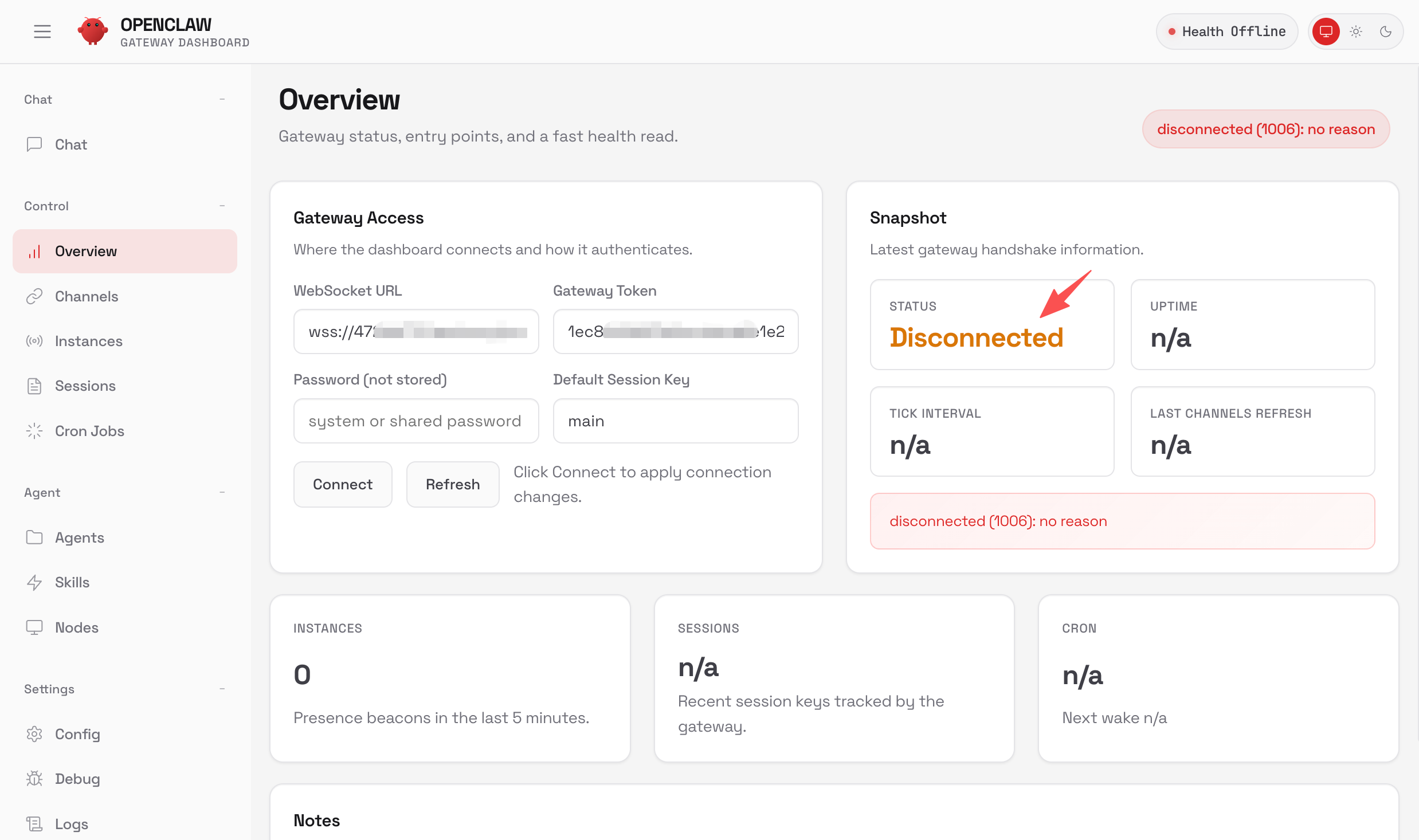 首次打开机器人网页版,会看到 Disconnected 状态,你还没有使用网页版的权限。